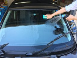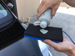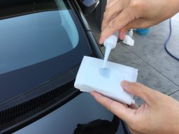 XG専用ガラスクリーナーを油膜取りスポンジに500円玉一個程度つける
