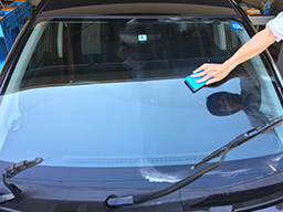 付属の青スポンジにティッシュを2枚重ねし液剤をガラス半面分つける